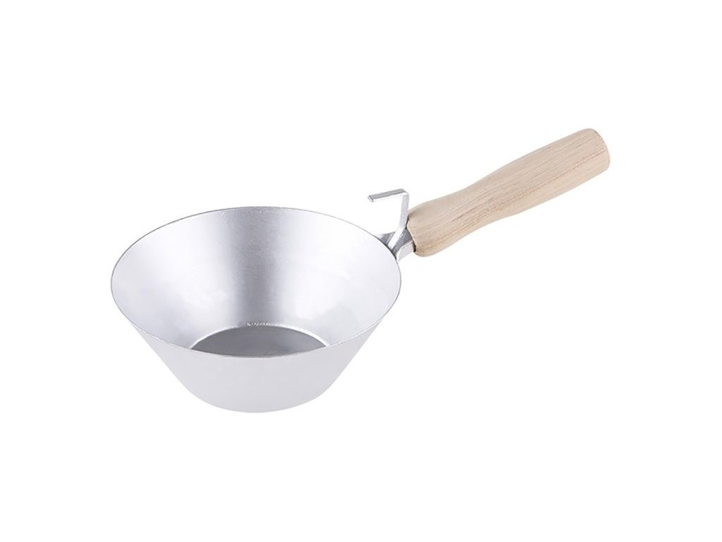 Zednická naběračka 180 mm s dřevěnou ručkou a s háčkem na pověšení. Je zednické nářadí používané pro přemisťování stavebních hmot: malta, beton atd.