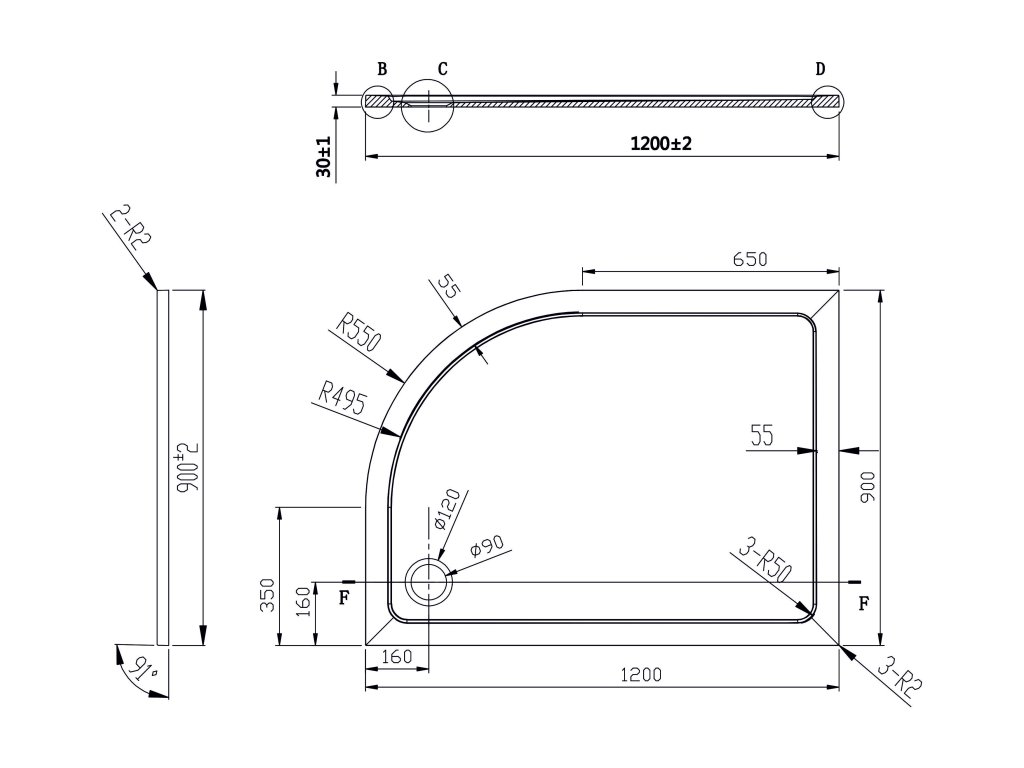Asymetrická čtvrtkruhová sprchová vanička VENETS 120x90x3 cm pravá