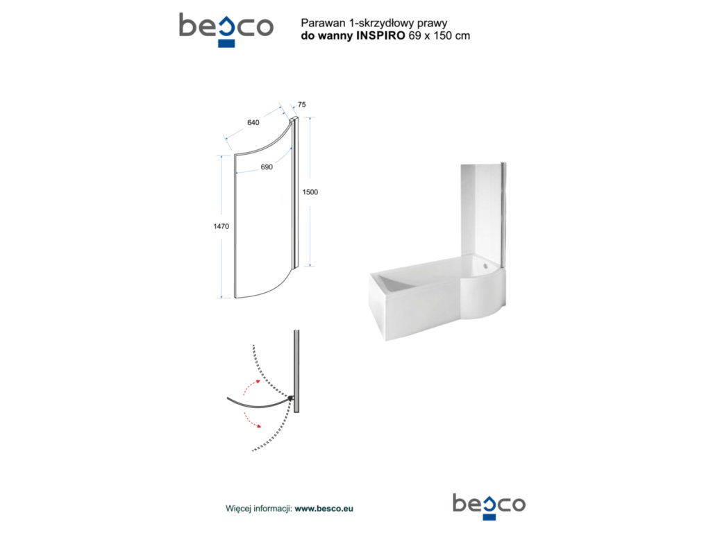 Asymetrická vana INSPIRO 150x70 cm levá včetně vanové zástěny