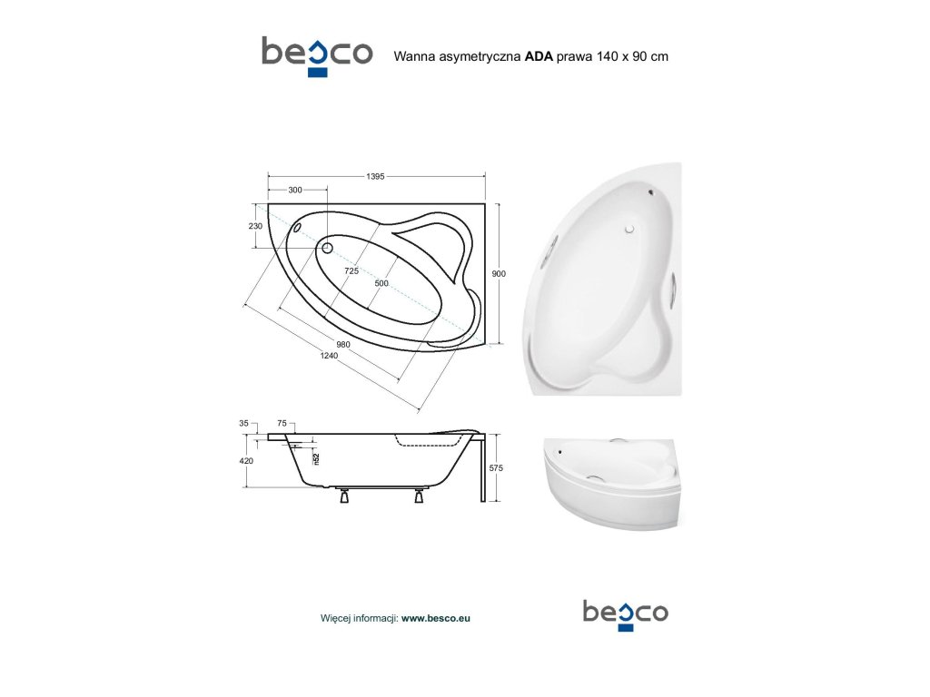 Vana ADA od výrobce BESCO v pravém provedení je navržena pro instalaci do pravého rohu koupelny. Její asymetrický design efektivně využívá prostor, přičemž délka 140 cm je maximální u stěny.