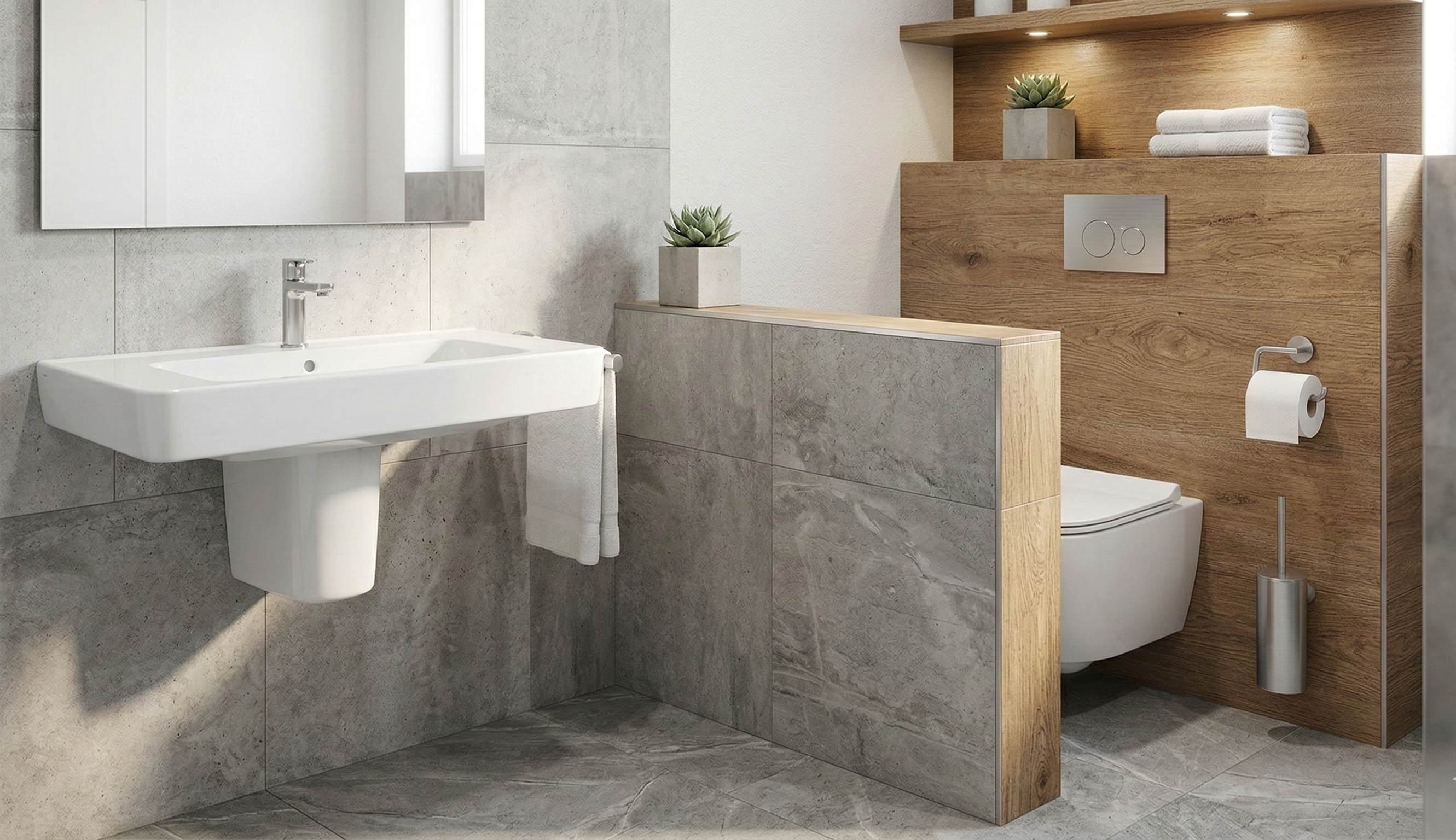 2. Optické zónování (Kouzla s prostorem) Záchod by nikdy neměl být "hvězdou" místnosti, na kterou padne zrak ihned po otevření dveří.