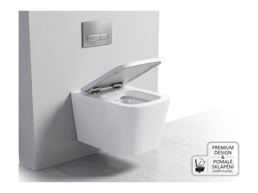 🚽 Závěsnou hranatou keramickou mísu BESTECO ORLO (bílá lesklá) 💺 Elegantní a tenké SLIM Soft-Close sedátko z duroplastu 🔩 Sadu pro moderní skryté uchycení keramiky k modulu 📄 Přehledný a detailní návod k montáži