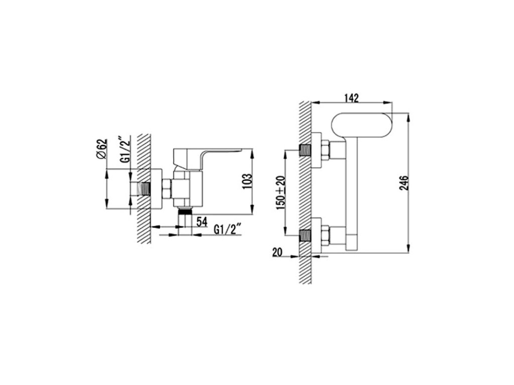 Sprchová baterie je navržena pro standardní nástěnnou instalaci s přesnými rozměry a parametry.