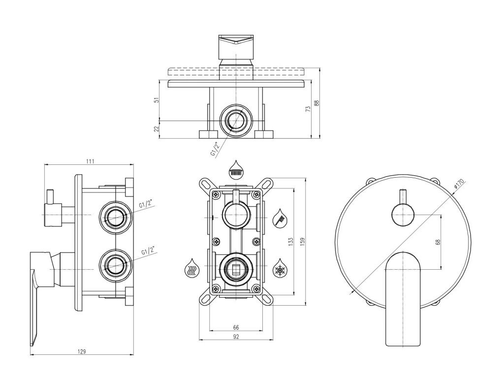 Baterii můžete použít buď do sprchového koutu jako kombinaci tří prvků a nebo k vaně jako kombinaci např. napouštění přepadem, ruční sprcha a hlavová sprcha nebo výtokové ramínko, ruční sprcha a hlavová sprcha.