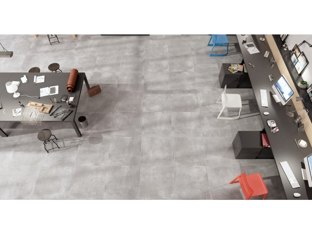 Velkoformát a Design: Formát opticky sjednocuje prostor a minimalizuje počet spár, což usnadňuje údržbu. Neutrální šedá barva s jemnou strukturou betonu je časově odolná a trendy.