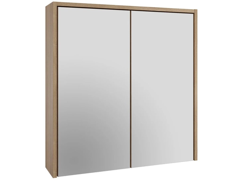 Skříňka je vyrobena z lamina o tloušťce 16 mm v dekoru Dub Sonoma, který přináší do koupelny hřejivý a přírodní vzhled. Hrany jsou opatřeny melaminovou úpravou pro vyšší odolnost. Design je účelný a čistý – dvoukřídlá zrcadlová dvířka poskytují velkou odrazovou plochu pro každodenní úpravu zevnějšku. Tlumení dovírání je zde řešeno jednoduše a efektivně pomocí nalepovacích silikonových čoček, které zabraňují hlučnému nárazu dvířek o korpus.