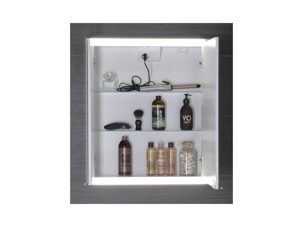 Elektro-Komfort: Skříňka je vybavena integrovanou elektrickou zásuvkou s vlastním spínačem osvětlení. Toto řešení eliminuje potřebu dalších kabelů a usnadňuje používání fénu, holicího strojku nebo elektrického kartáčku přímo u zrcadla.