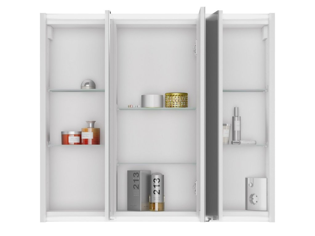 Propracovaný Úložný Systém: Vnitřní prostor je chytře rozdělen na tři samostatné vnitřní části, přičemž v každé části jsou umístěny dvě výškově nastavitelné skleněné poličky. To umožňuje dokonalou organizaci kosmetiky a hygienických potřeb přesně dle vašich představ.