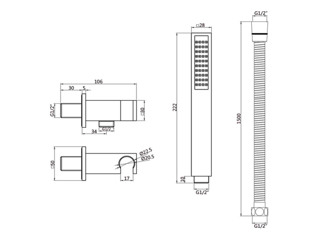 Hranatý vývod ze zdi pro ruční sprchu s příslušenstvím