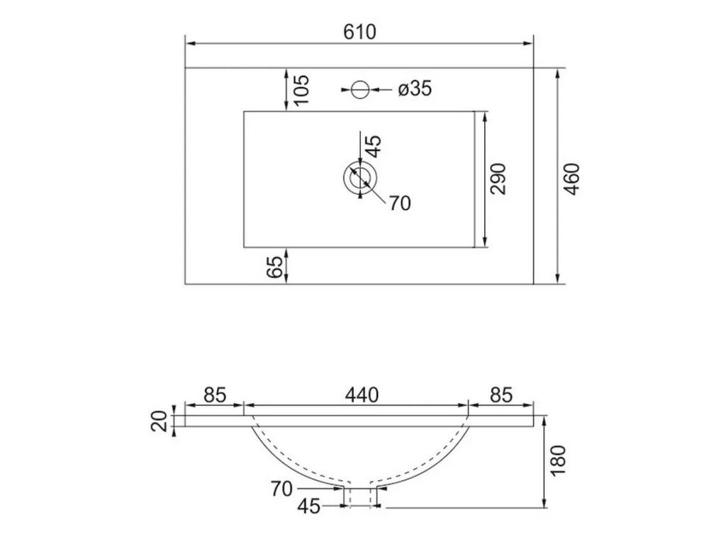 Šířka (Š): 60 cm (přesně 600 milimetrů), což je ideální šířka pro malé koupelny (nominální šířka umyvadla je 61 cm).