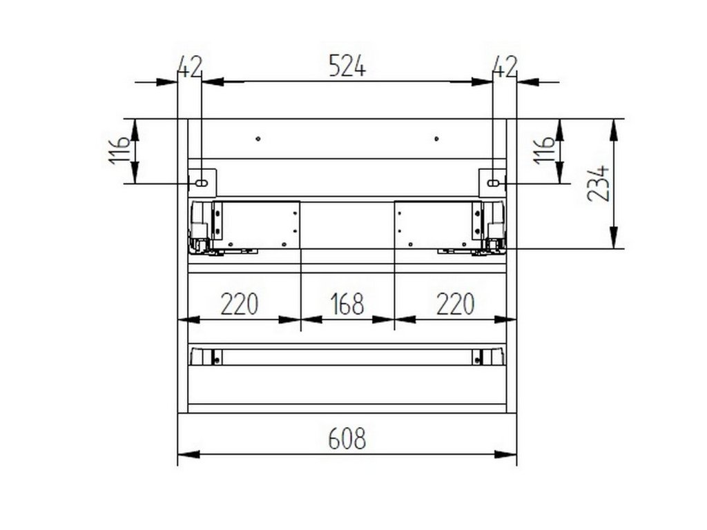 - Počet zásuvek: 2 plnovýsuvné zásuvky (horní zásuvka má vnitřní výřez pro sifon)