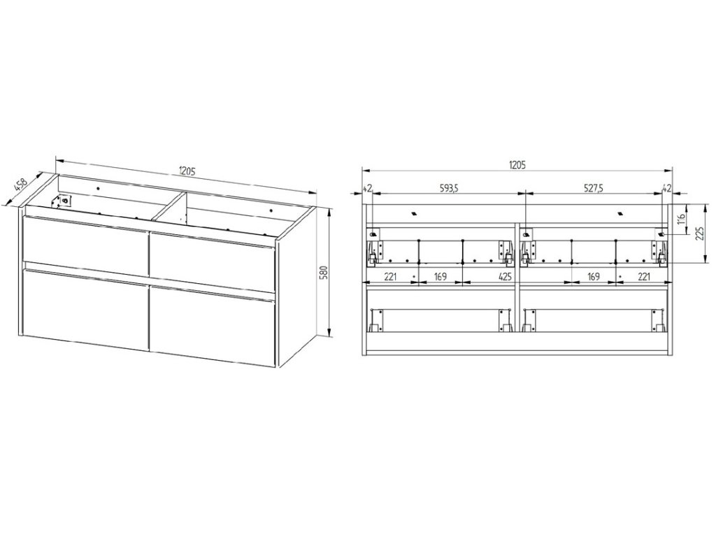 Skříňka je dodávána bez umyvadla/desky, baterie a sifonů.