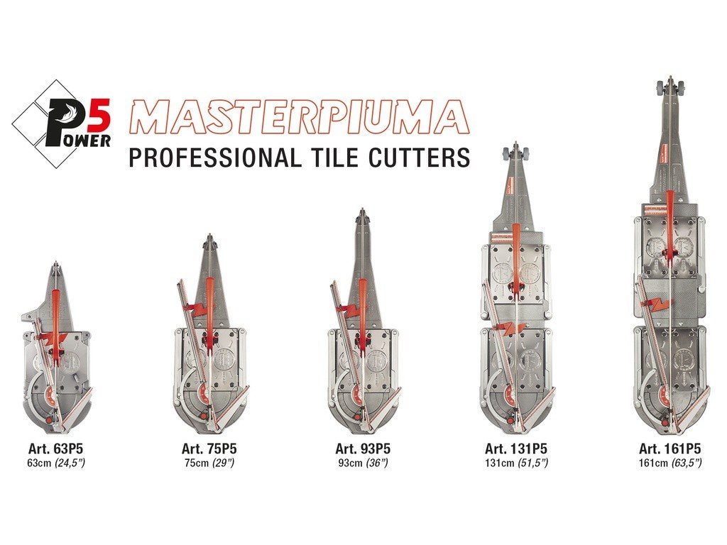 MASTERPIUMA 161P5 - ruční řezačka na obklady a dlažbu. délka řezu 161 cm diagonální řezání materiálu 113 x 113 cm ideální použití pro dlaždice tloušťky 5-15 mm hmotnost 29 kg řezání mozaiky pomocí speciální gumové podložky MOSAKIT 100% vyrobeno v Itálii viditelné kolečko při řezání boční výklopné podpěry na obě strany