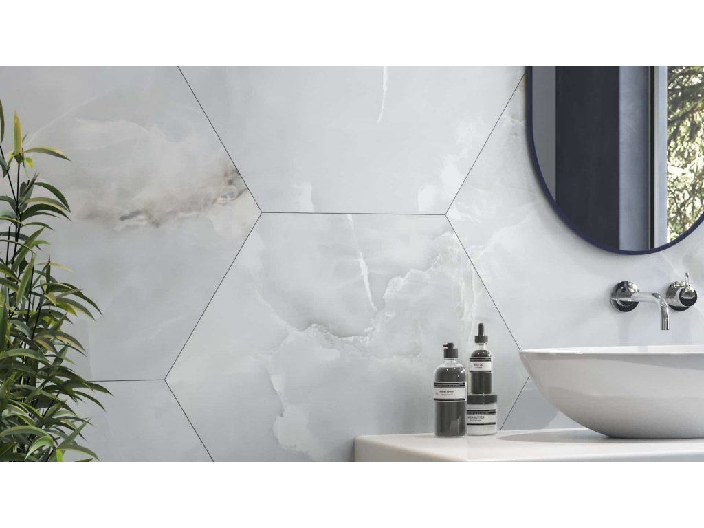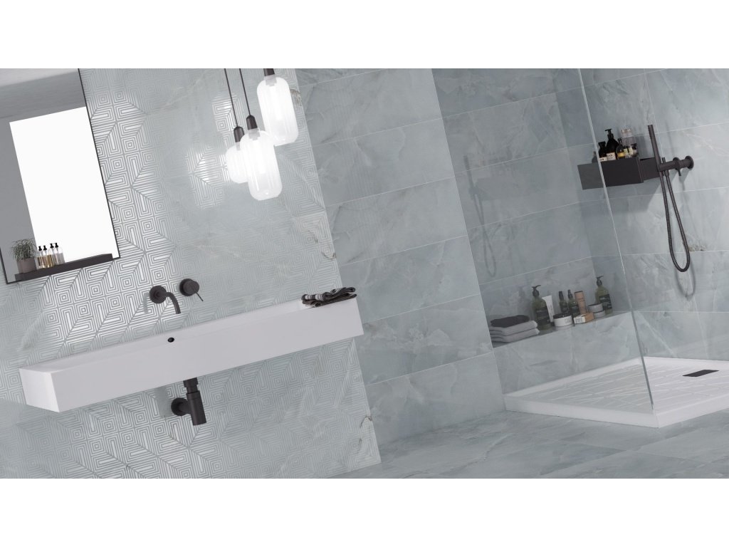 Exkluzivní modrý Onyx: Vzor věrně imituje průsvitnou hloubku a vrstvenou kresbu vzácného modrého onyxu. Světle modrá barva s bílými a šedými žilkami vnáší do prostoru atmosféru klidu a čistoty.