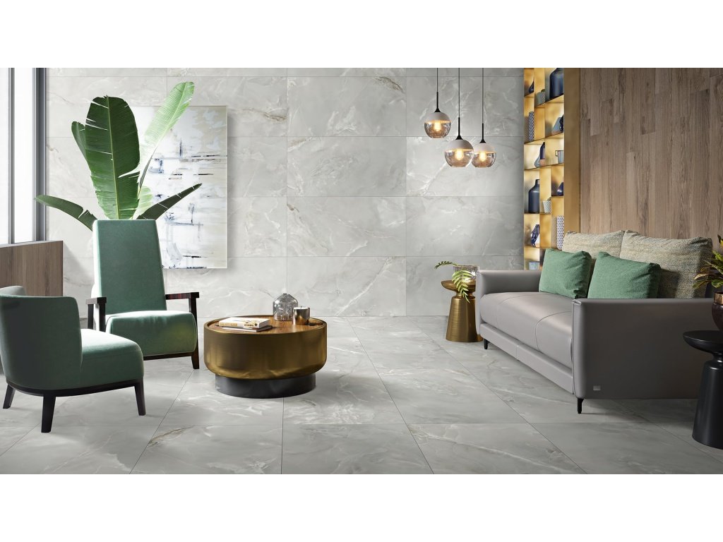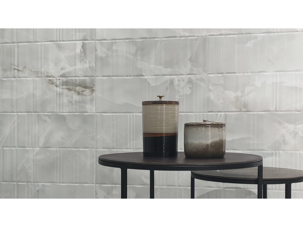 Design Světle Šedého Onyxu: Mozaika věrně napodobuje vrstvenou strukturu a jemné, stříbrné žilkování vzácného šedého onyxu. Barva je neutrální světle šedá, což ji činí extrémně univerzální pro kombinaci s jakýmikoliv doplňky a barvami.