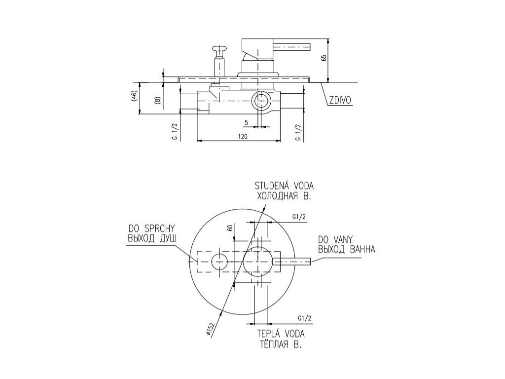 Určení: Vanová/sprchová vestavěná baterie s možností volby dvou výstupů vody (např. hlavová sprcha a ruční sprcha nebo napouštění vany a ruční sprcha).