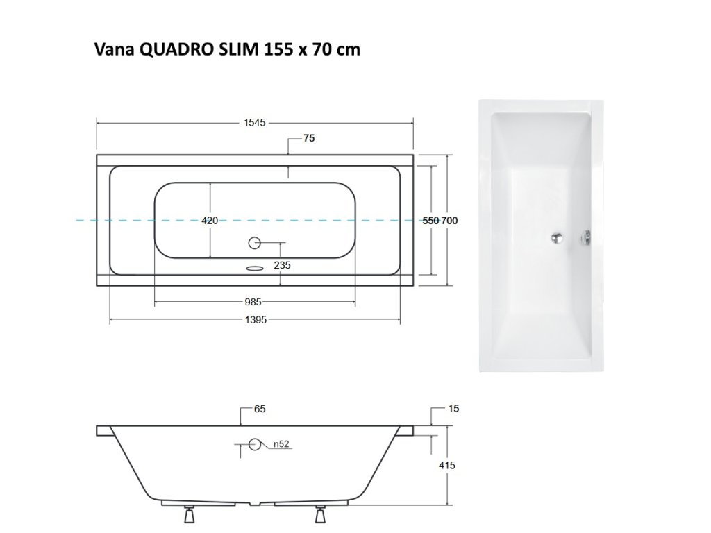 Obdélníková vana QUADRO SLIM 155x70 cm