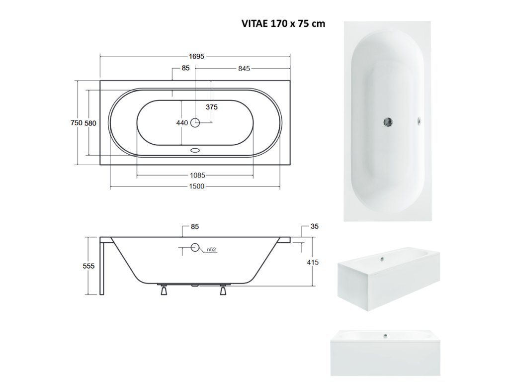 Obdélníková vana Vitae 170x75 cm vyniká vysoce kvalitním zpracováním a spolehlivou funkčností všech součástí a materiálů.