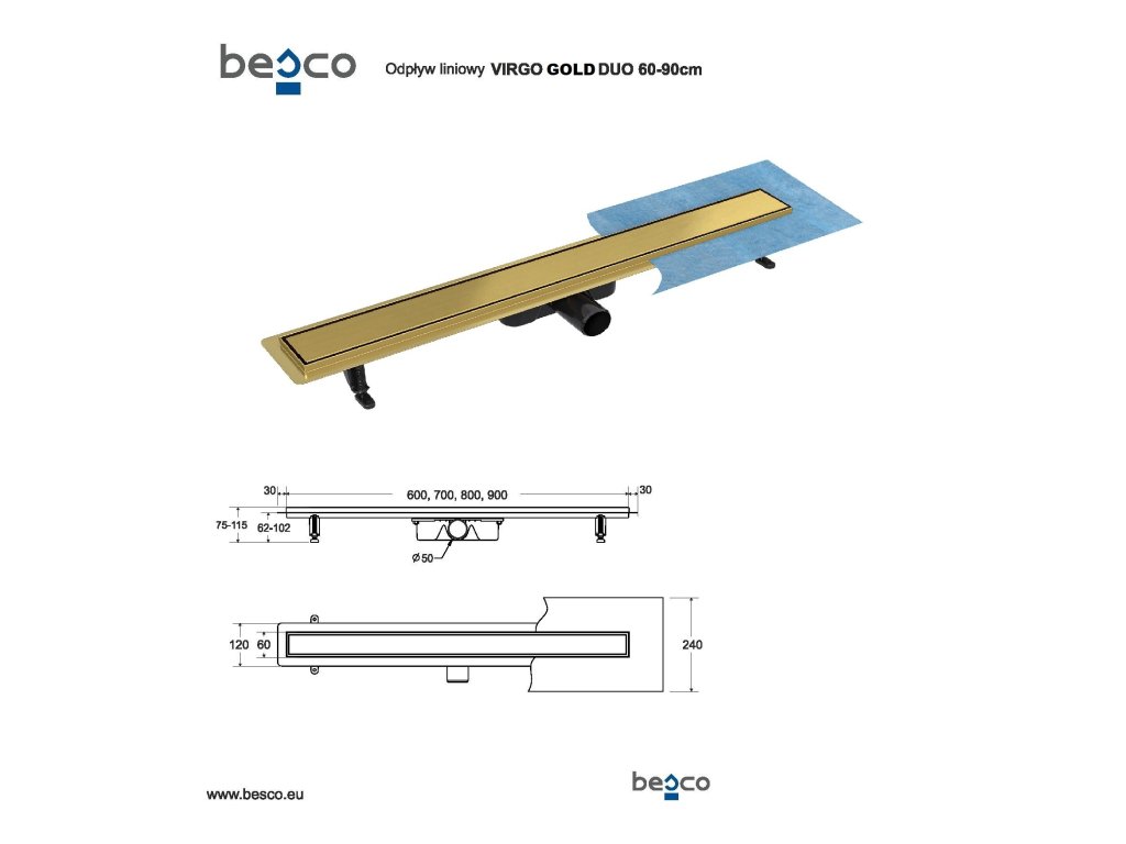 Odtokový žlab VIRGO DUO GOLD- 90: délka roštu 90 cm, délka žlabu 96 cm