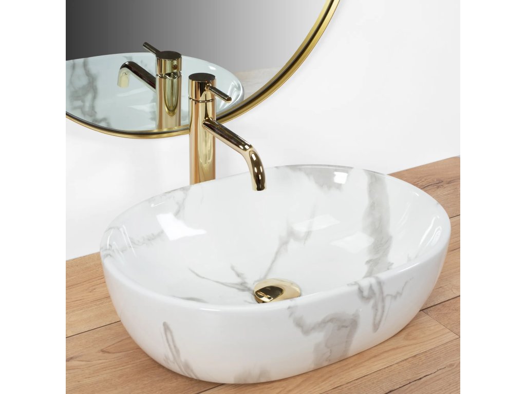 Model AMELIA MARMO se vyznačuje elegantním oválným tvarem a vizuálně lehkou konstrukcí díky technologii tenkostěnné keramiky. Povrchová úprava imitující černý mramor s výrazným bílým žilkováním dodává umyvadlu hloubku a punc luxusu. Tento designový kousek je ideální pro koupelny laděné do stylu glamour, moderního minimalismu nebo industriálního designu, kde slouží jako dominantní estetický prvek.