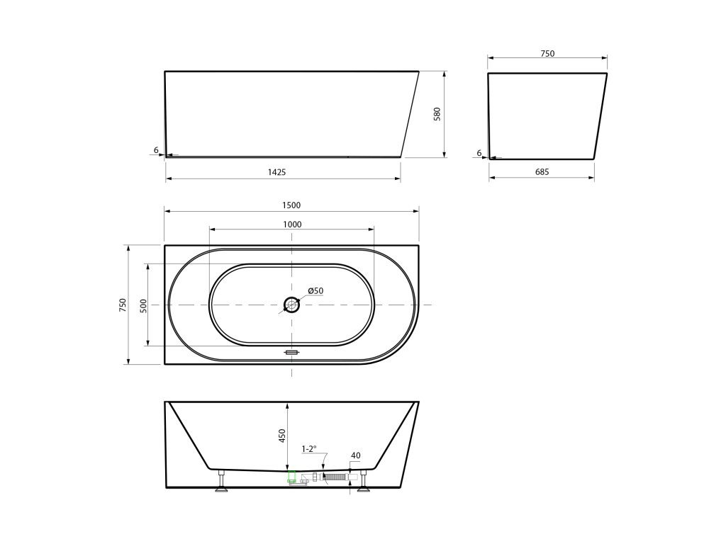 - Obsah balení: Vana, nožičky, sifon, Click-Clack výpust, přepad.
