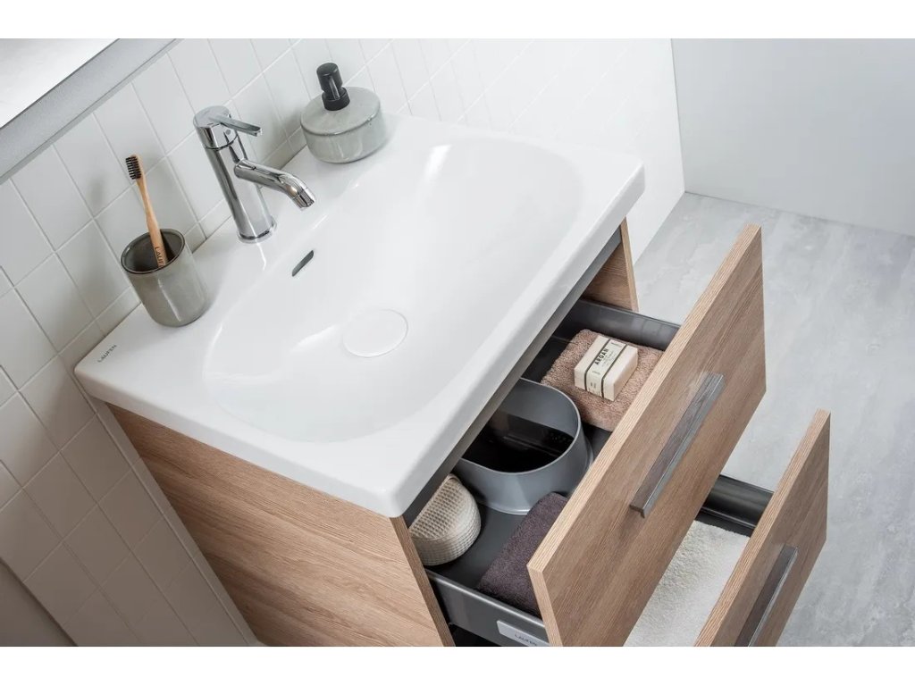 Optimalizace pro Instalaci: Horní zásuvka má výřez pro sifon, což umožňuje bezproblémovou instalaci umyvadla (umyvadlo 55x46 cm je doporučeno, prodává se zvlášť) a maximalizuje využití vnitřního prostoru.