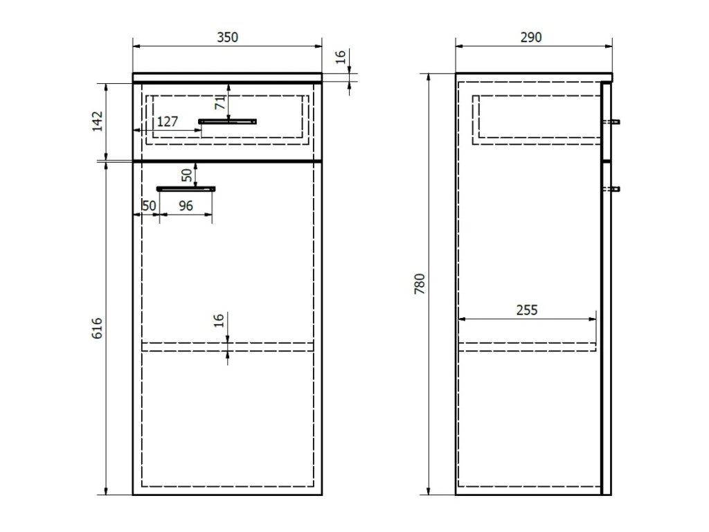 Skříňka je navržena jako úzký, spodní modul s praktickou hloubkou: