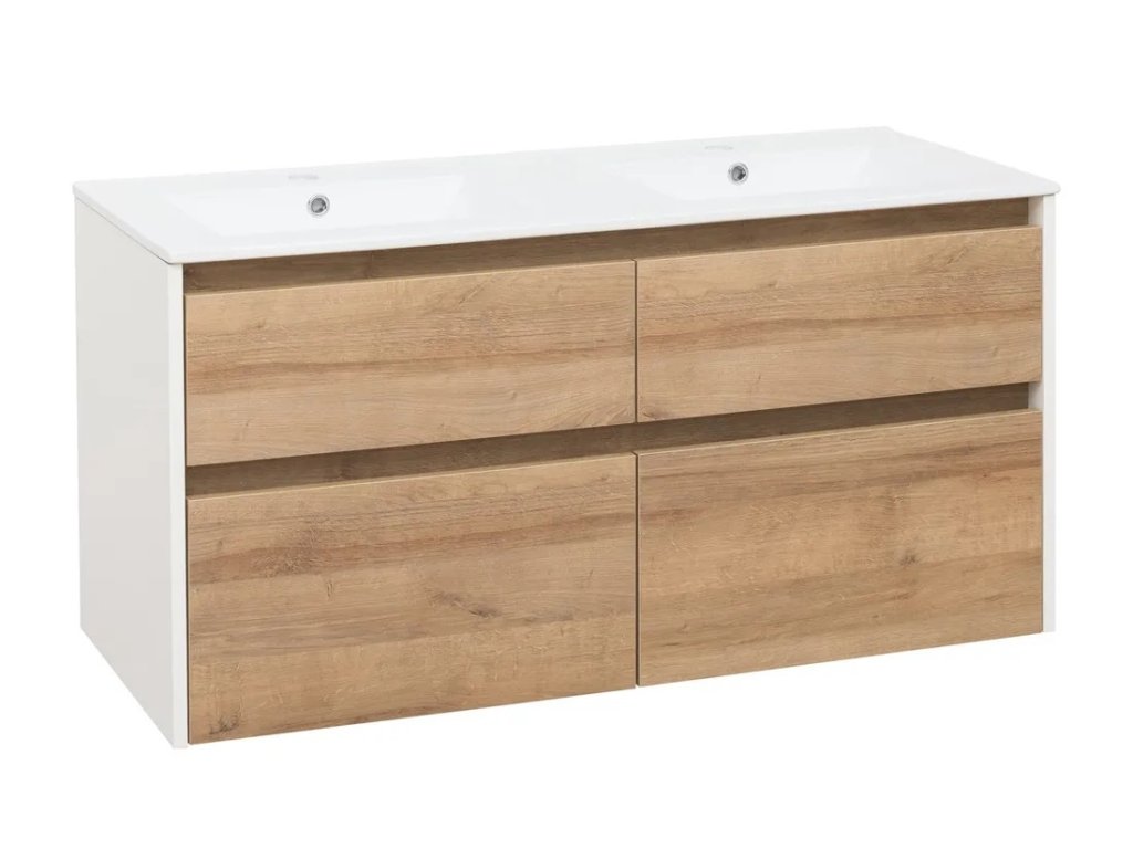 Skříňka s keramickým dvojumyvadlem DUOMO 121x46 cm Bílá lesk/Dub riviera