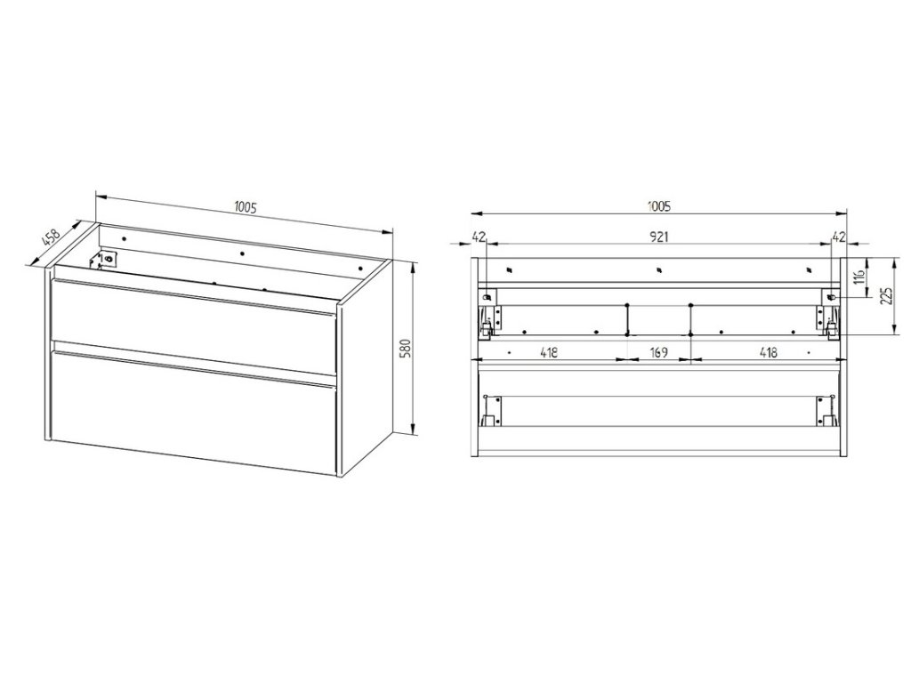 - Šířka (Š): 100 cm (přesně 1000 milimetrů). (Nom. šířka umyvadla je 101 cm.)