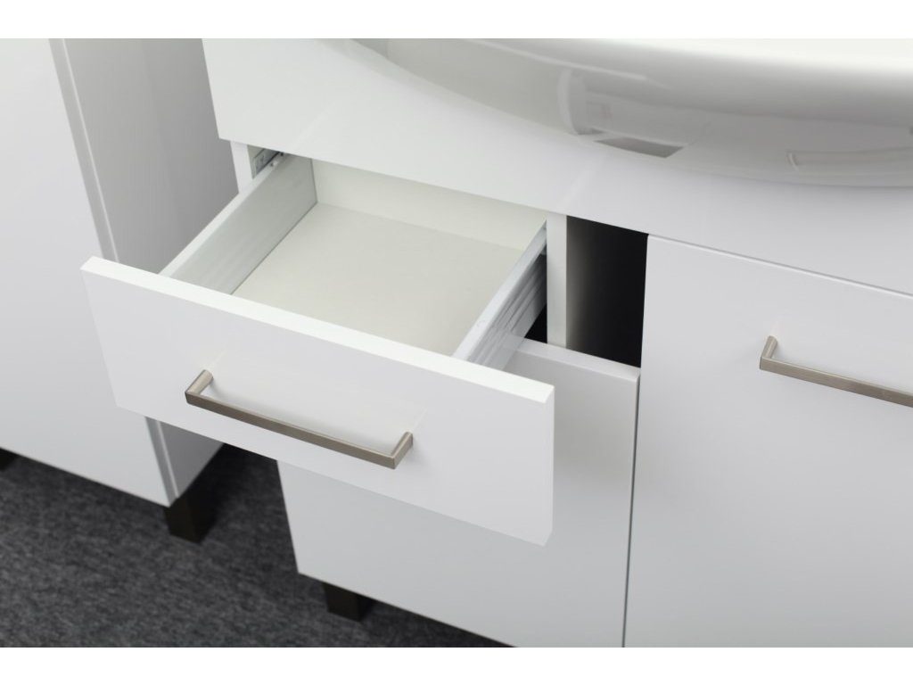 Integrované Úložné Prostor: Spodní skříňka v obou variantách (RINO 75 i RINO 85) disponuje dvěma dvířky a jedním praktickým šuplíkem pro efektivní uspořádání koupelnových doplňků.
