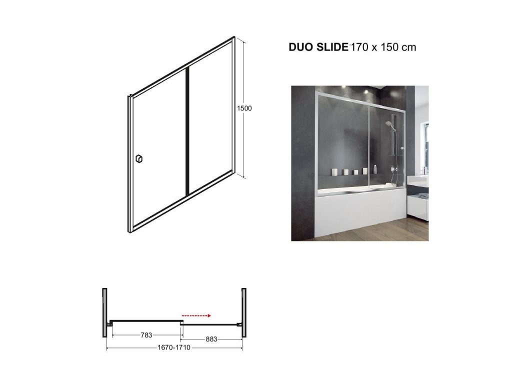Luxusní vanová zástěna DUO SLIDE II dokonale chrání Vaší koupelnu při koupání i sprchování. Je dodávána v provedení s 6 mm bezpečnostním sklem a nabízí jednu posuvnou stranu.