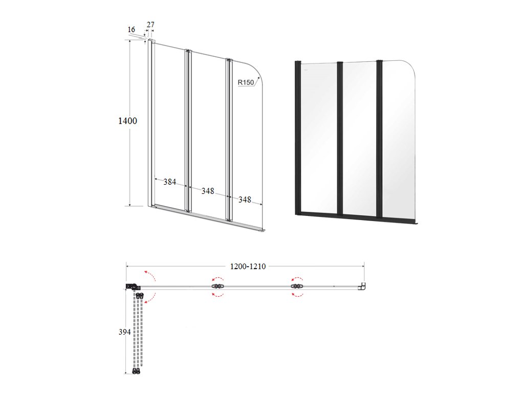 Vanová zástěna PRIME třídílná 120x140 cm černá matná