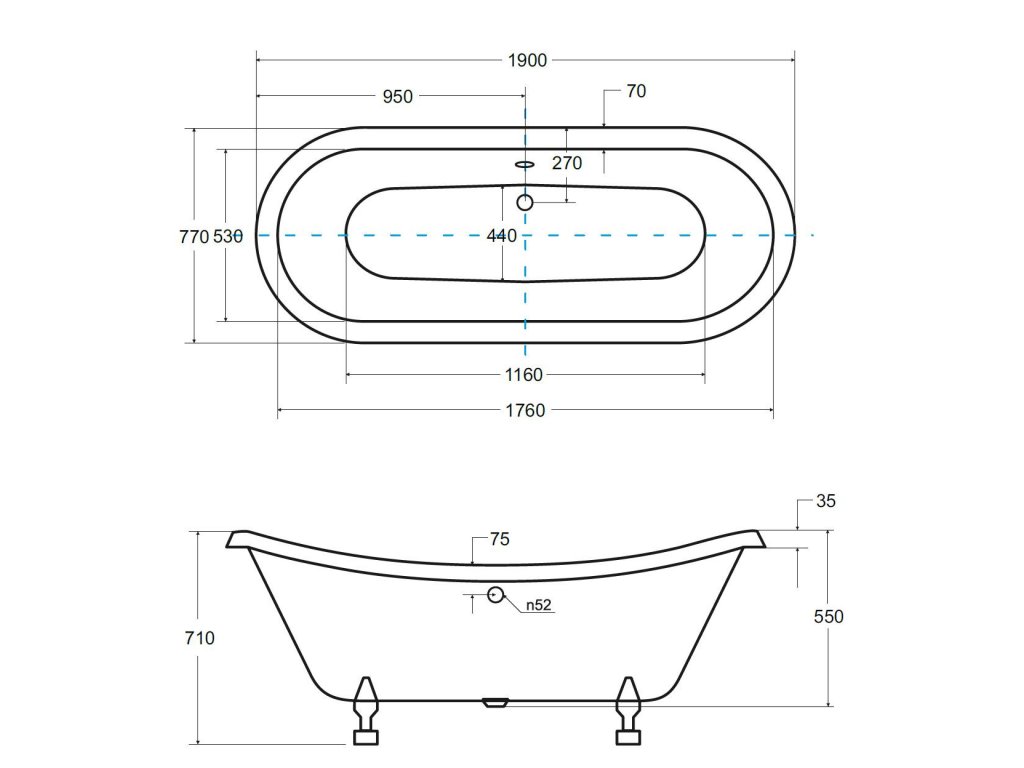 Volně stojící vana AMELIA bílá 190x77 cm, bílé nožičky