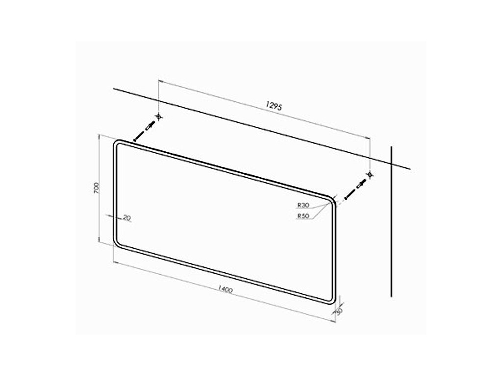 Design a Osvětlení: Zrcadlo má elegantní široký obdélníkový tvar (1400 mm na šířku x 700 mm na výšku) s minimalistickým a tenkým profilem. Osvětlení je realizováno LED páskem po celém obvodu zrcadla, skrytým pod matným pásem na zrcadlové ploše. Toto obvodové osvětlení zajišťuje rovnoměrné nasvícení tváře bez stínů.